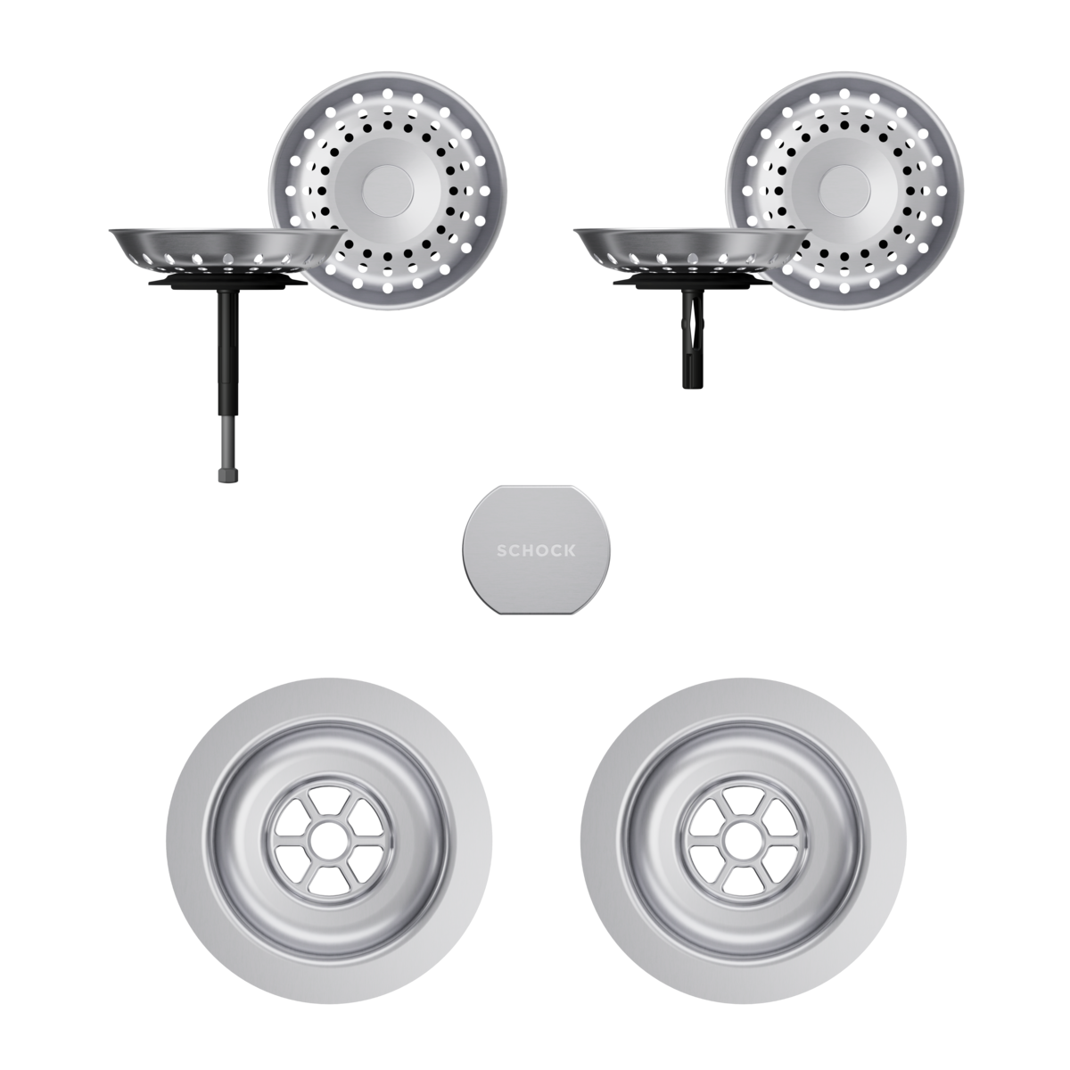 Sichtteile in Edelstahl massiv bestehend aus Drehgriff für Exzenterbedienung, Ablaufkelch und Überlaufblende(n) passend zum Spülenmodell.